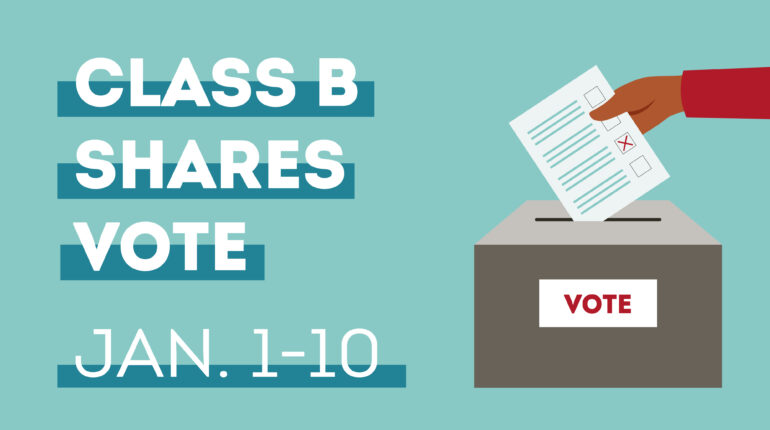 The board of directors recommends that we update our articles of incorporation to increase the allowed amount of Class B shares from 1,100,000 to 5,000,000. Voting will be from Jan. 1 to 10, and owners can vote in stores at the customer service desk or online.