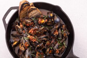 This flavorful poaching broth calls for plain kombucha and is seasoned with shallots, garlic, fish sauce, and lemon. Mussels are a delicious and sustainable seafood, packed with protein, Omega-3s, and zinc, and this is a fun way to enjoy them!